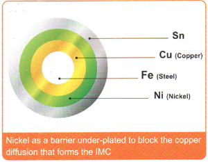鍍鎳層,為無缺陷 /無孔性 (defect-free) 及光澤性,可幫助外鍍層錫 (Sn)平滑及更具延性。 - Nickel acts as a diffusion barrier between the copper alloy and the Tin.